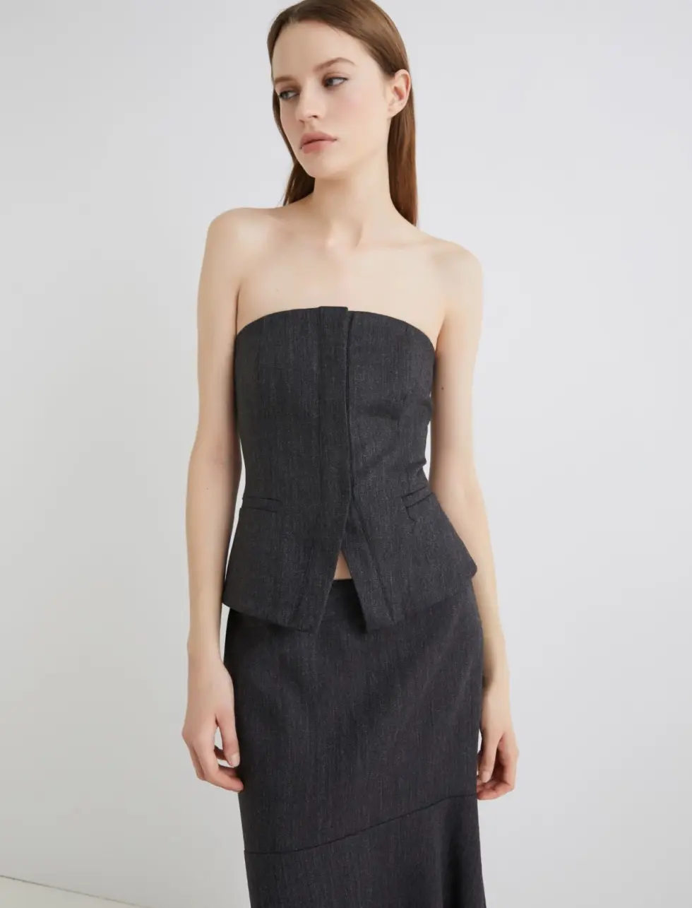 Sinnlich mit dem gewissen Etwas: Dieses neue Wollkorsett besticht durch figurbetonende, tiefe Abnäher vorne. Die beiden mittleren