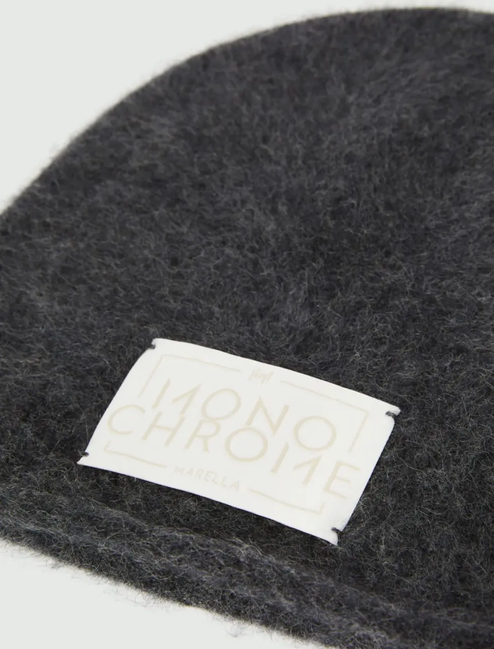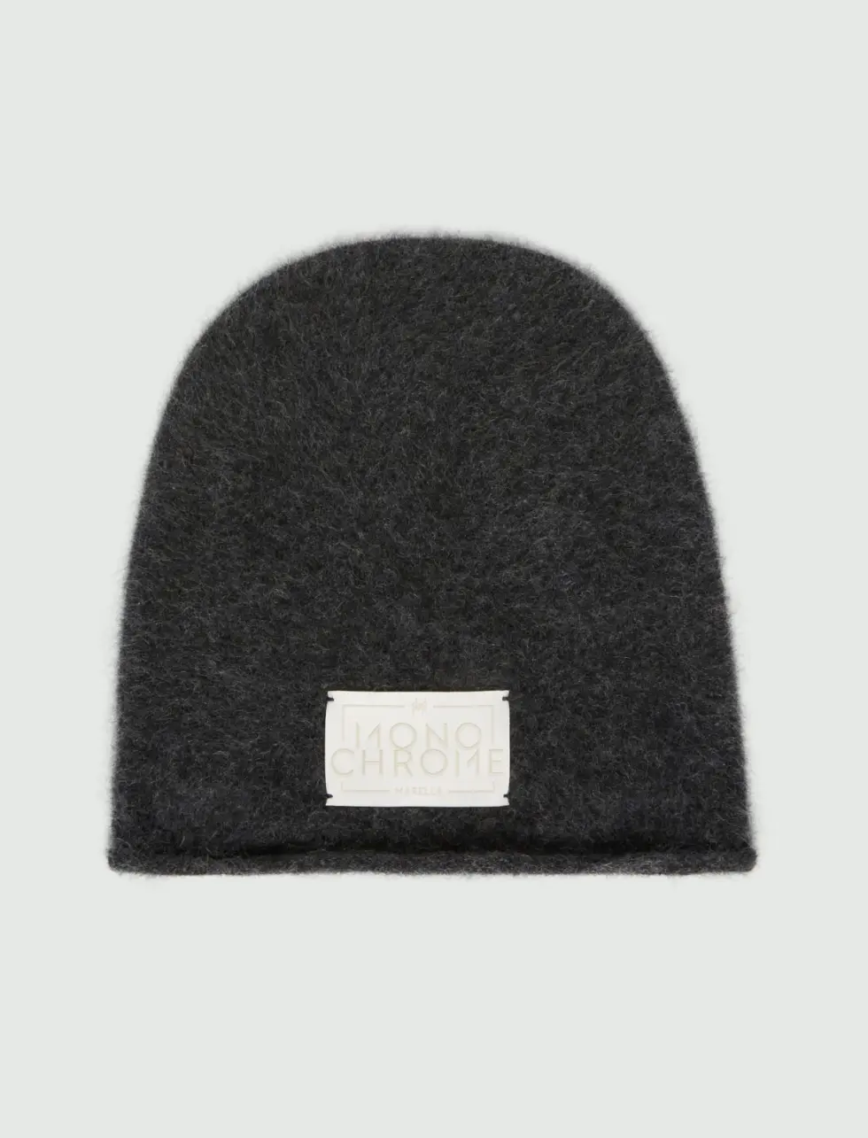 This soft and thin new cashmere-blend beanie hat is decorated with a large branded label.