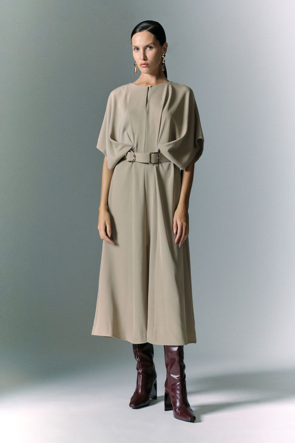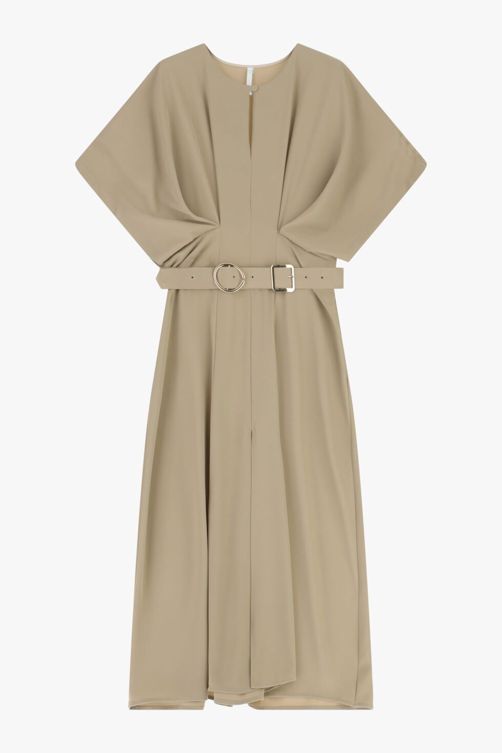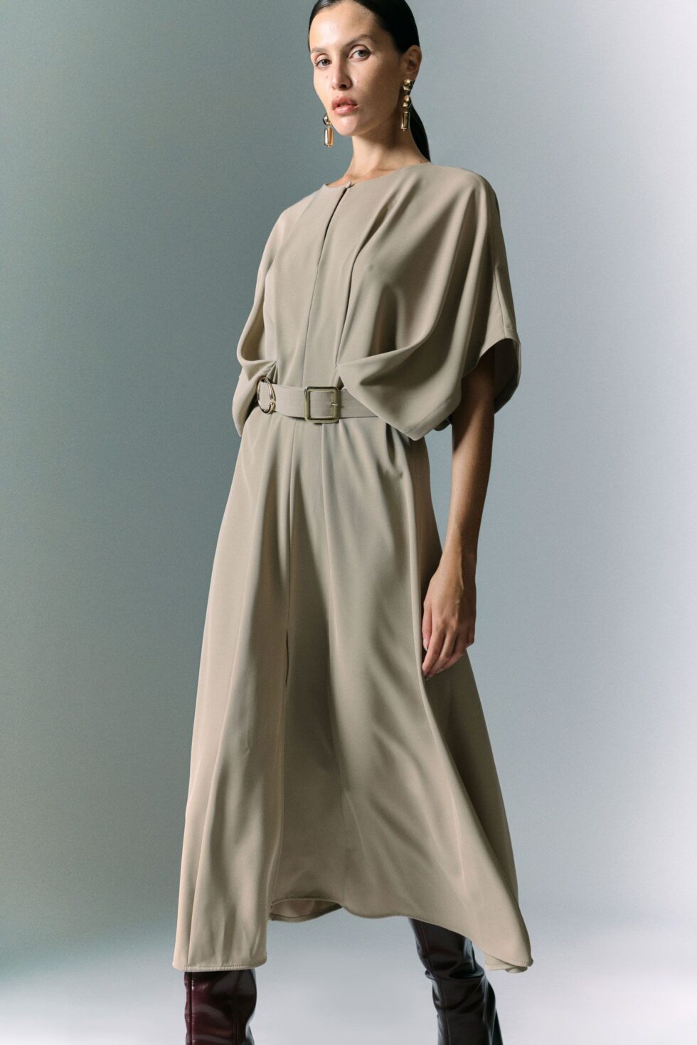 sleeves, and a waist belt accentuating the silhouette, ideal for elegant occasions. The clean line and