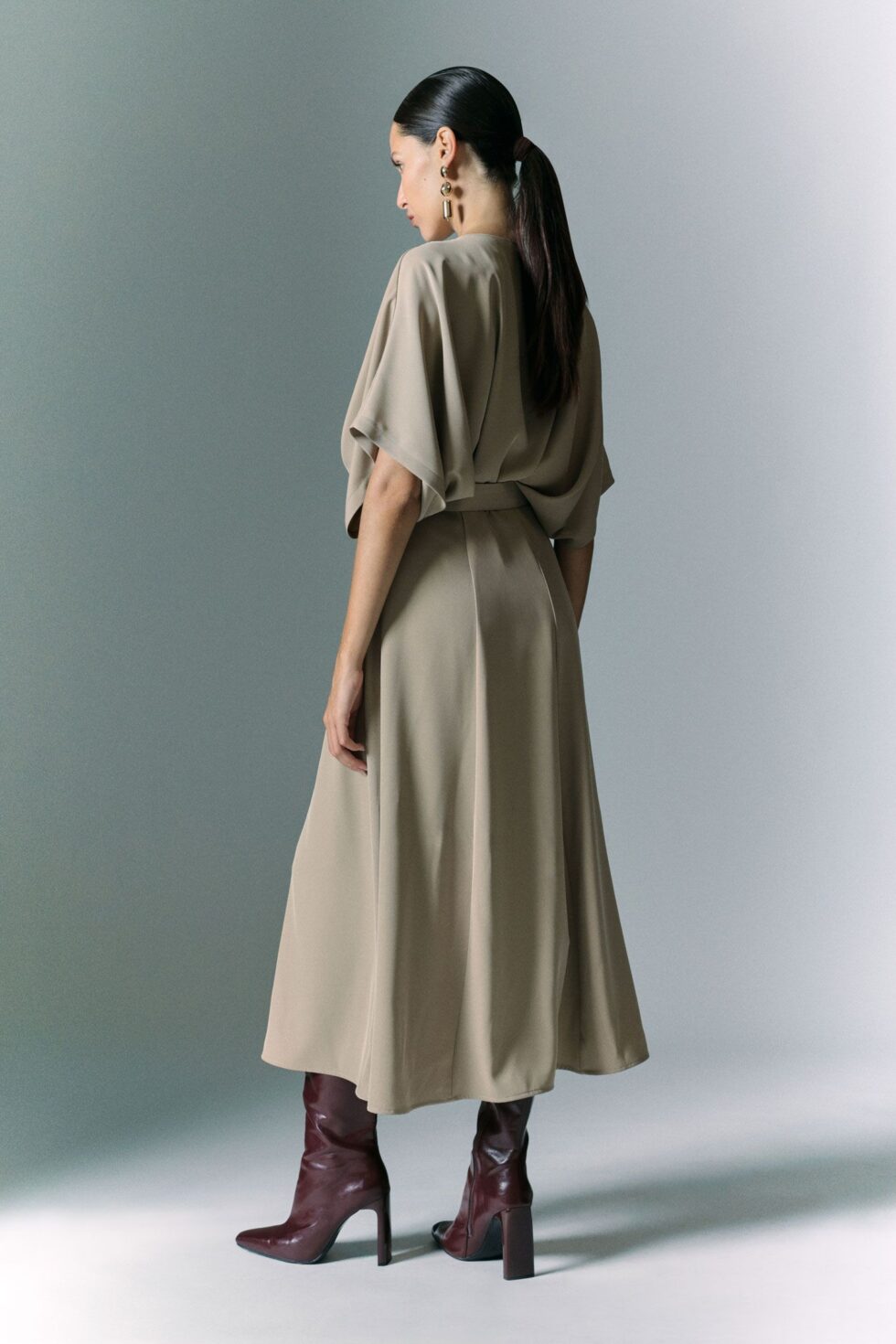 A mid-length dress that combines refinement and functionality. Featuring a round neckline, fluid short