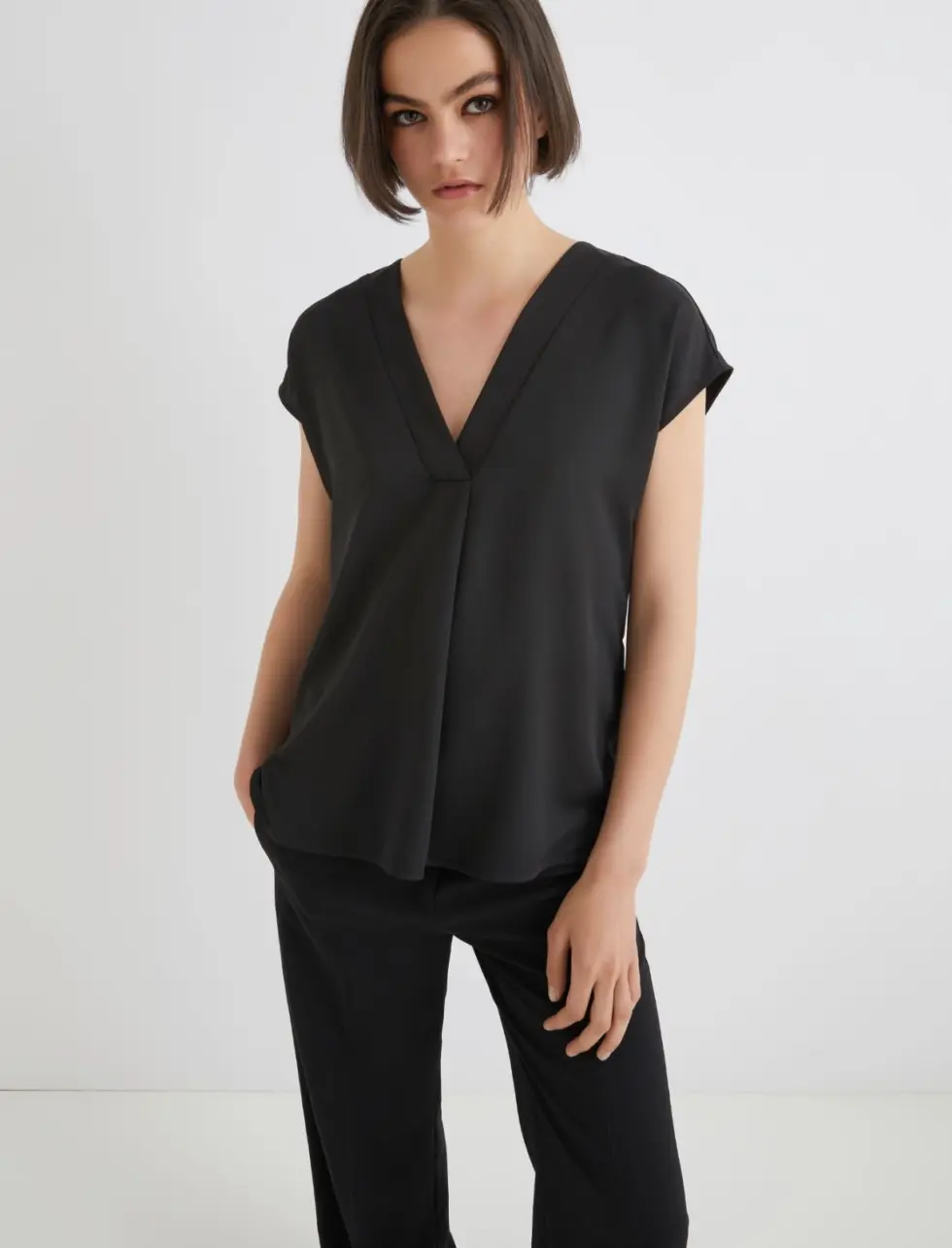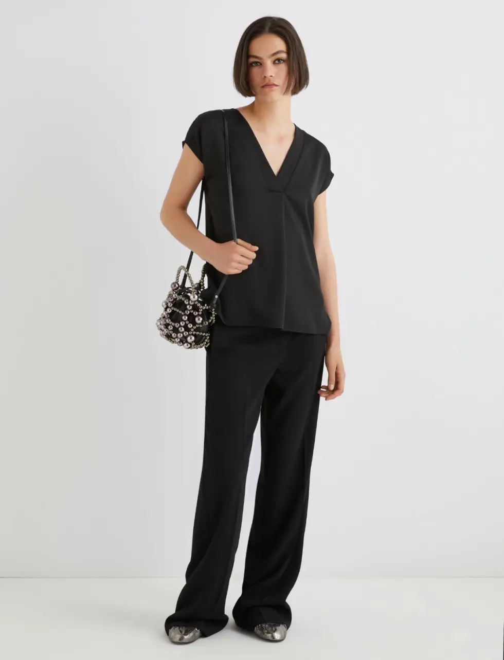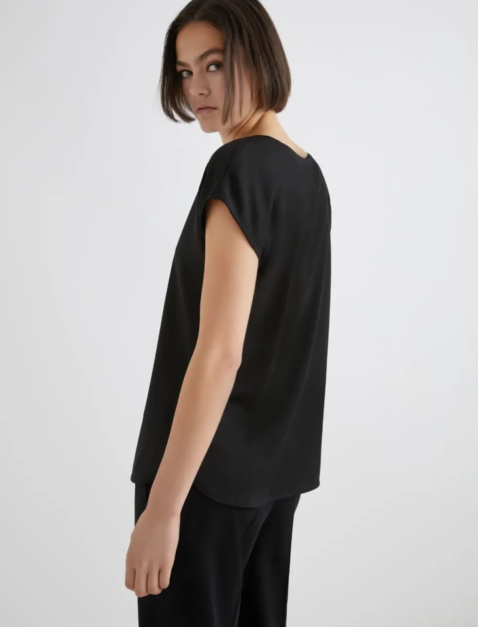 Minimalist with a twist: this satin blouse caresses the skin and reflects light, thanks to its subtle shine. It