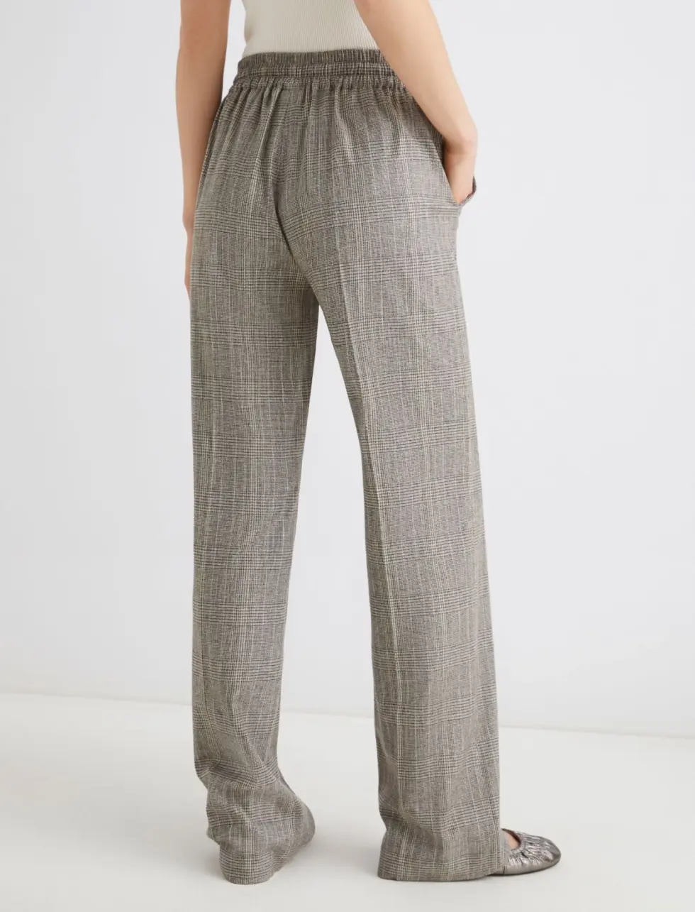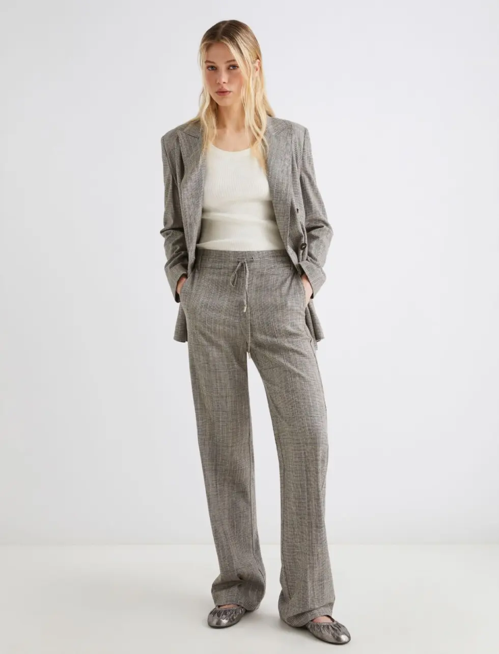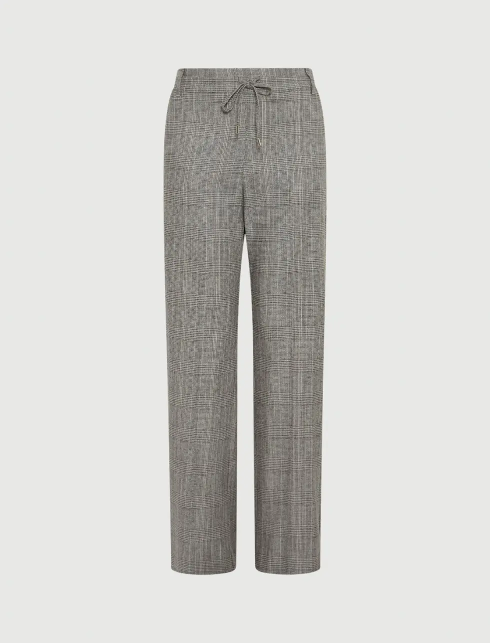 These new jogger-style trousers combine elegant herringbone fabric with an informal waist drawstring.