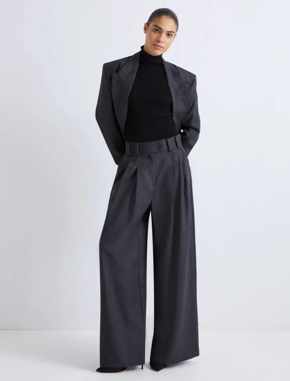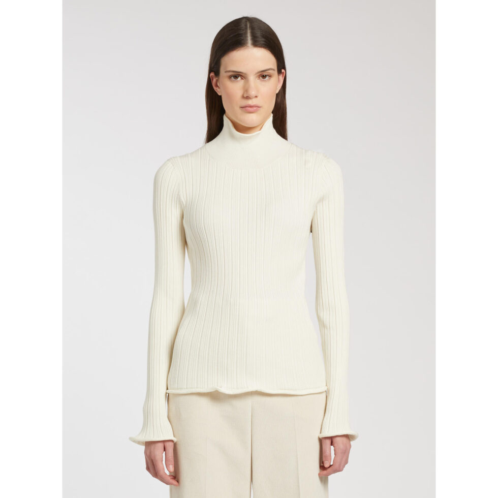 gathered cuffs and flat rib-knit pattern define an ultra-contemporary silhouette.