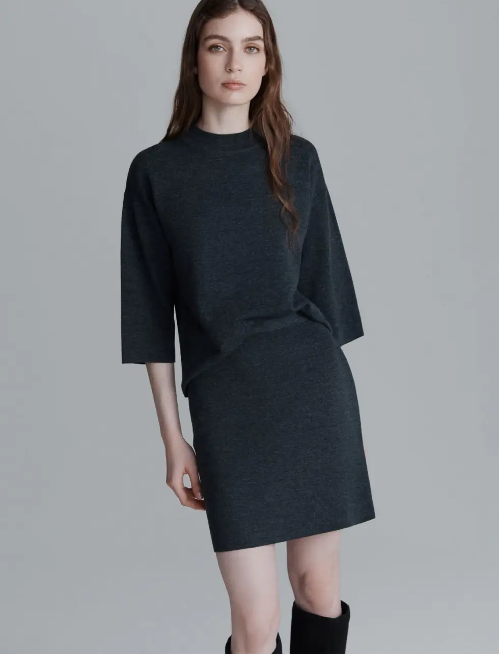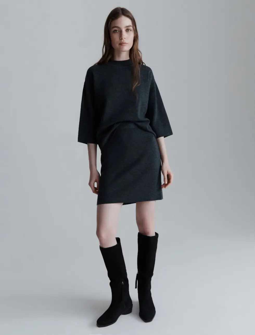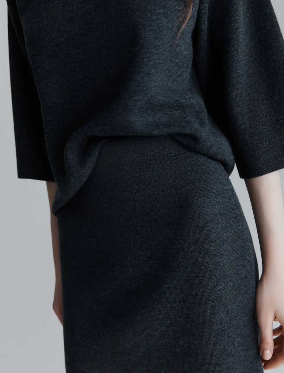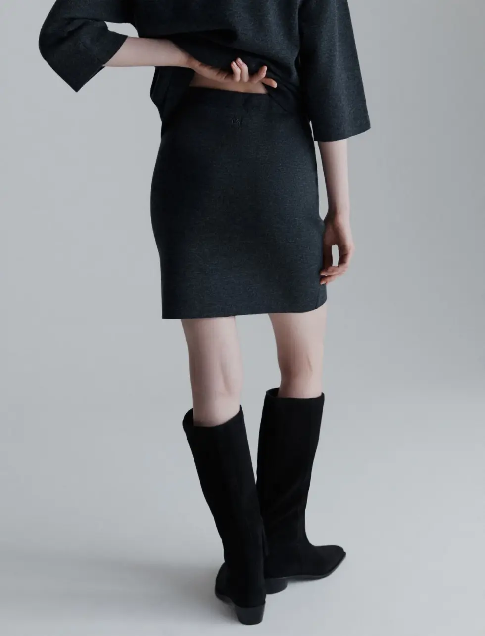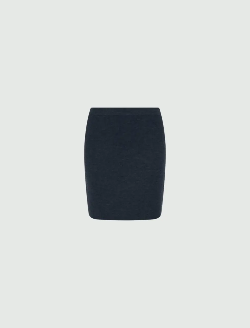 Skirt in compact merino wool knit fabric with a straight fit at the hips and mid-thigh length. It pairs