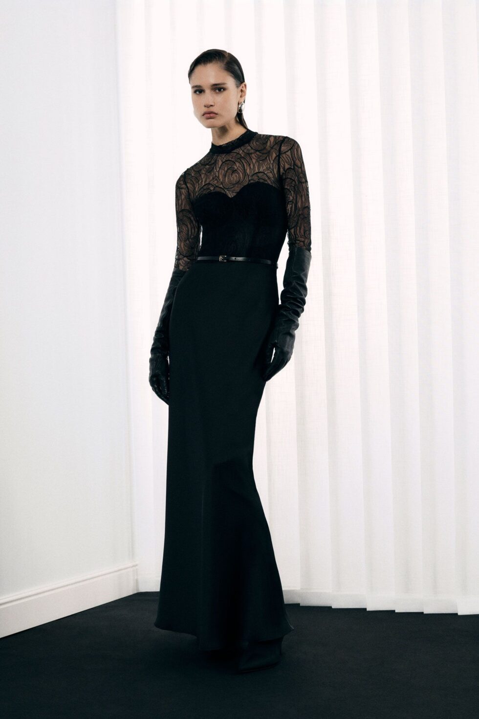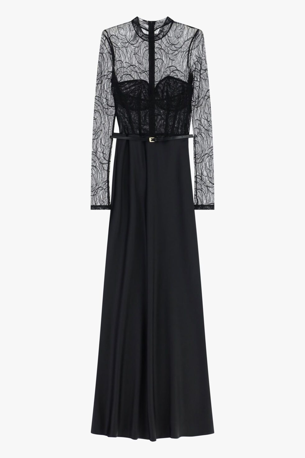 Long dress featuring a sleek silhouette and a semi-sheer lace bodice with an intricate floral motif. The