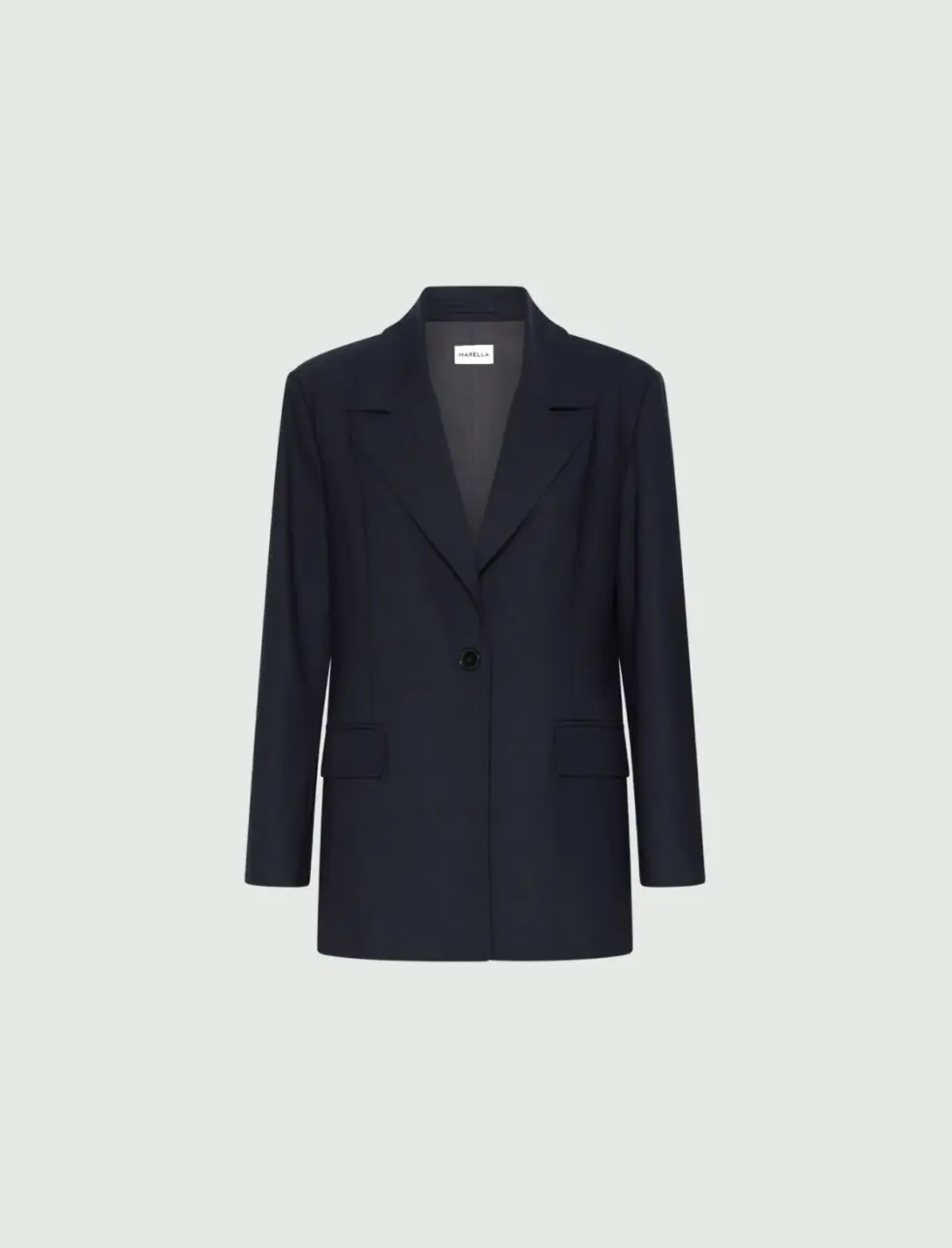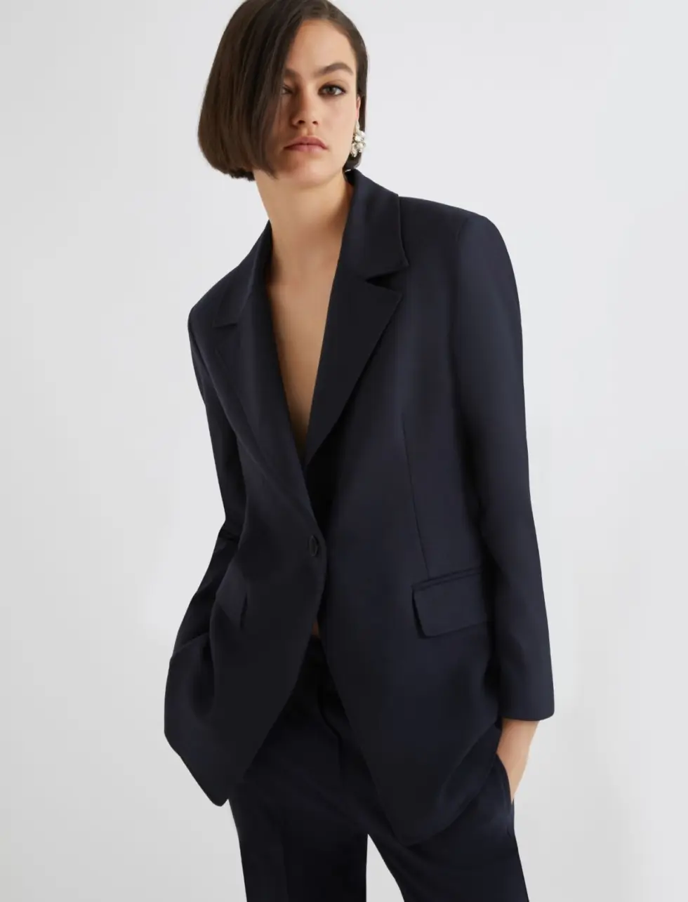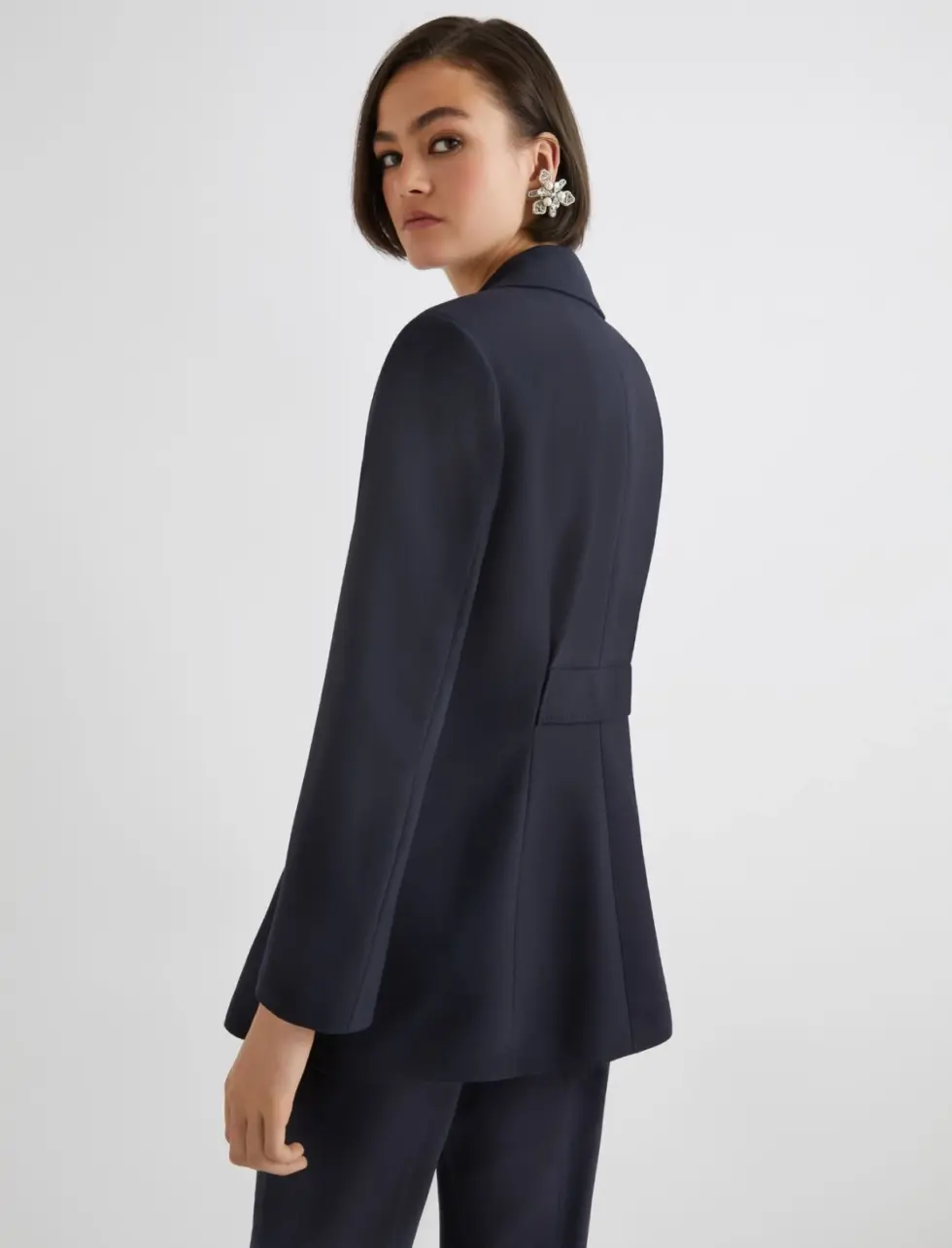 Fabric 53% polyester, 43% virgin wool, 4% elastane; lining 64%