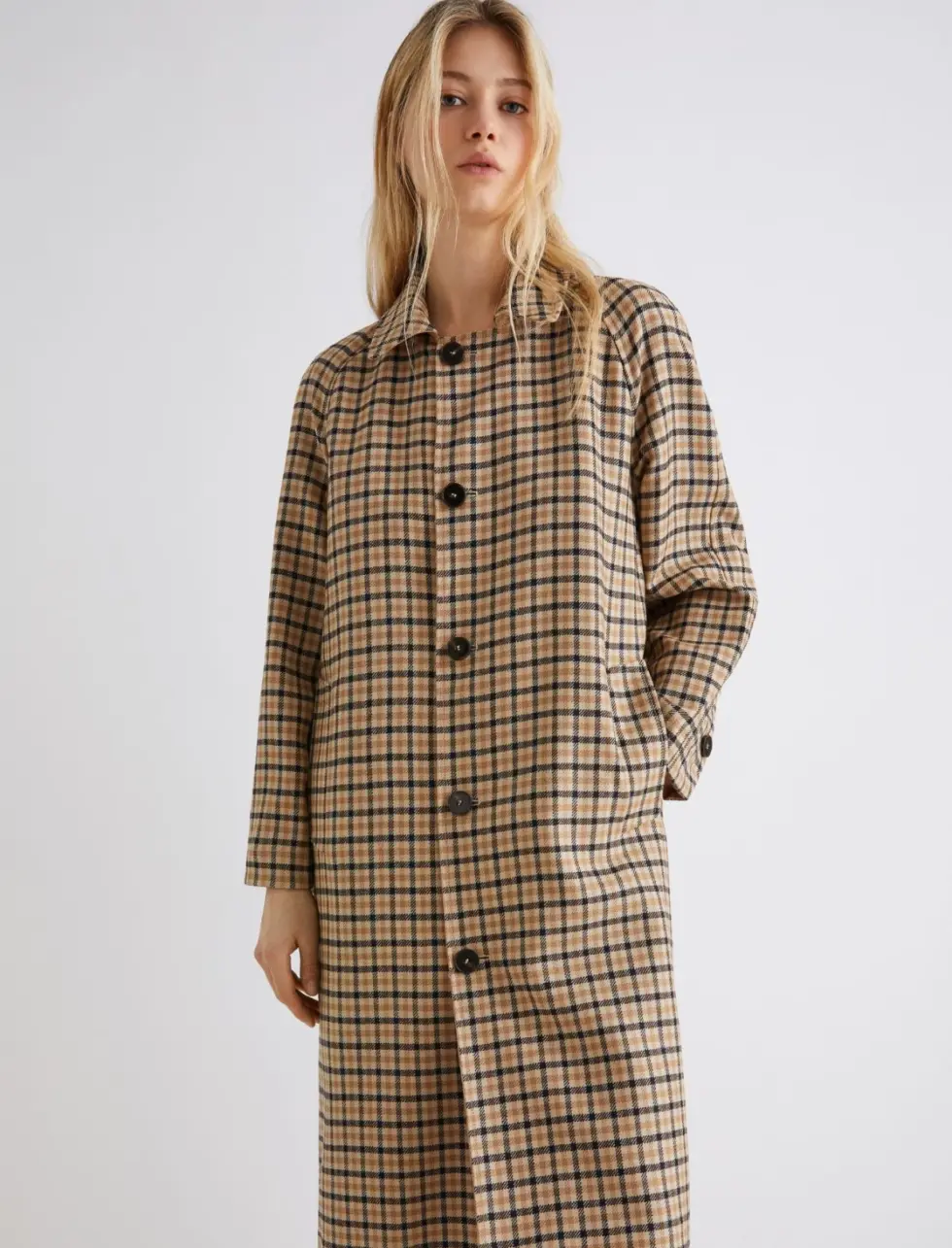 - Single-breasted button fastening and a belt with a double O-ring buckle