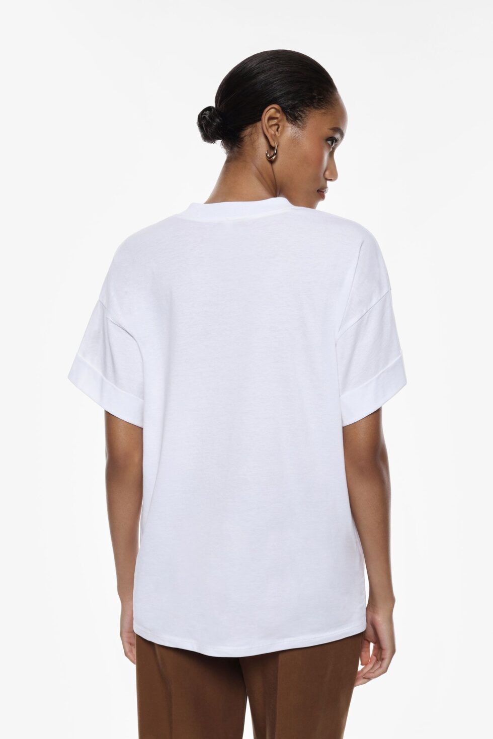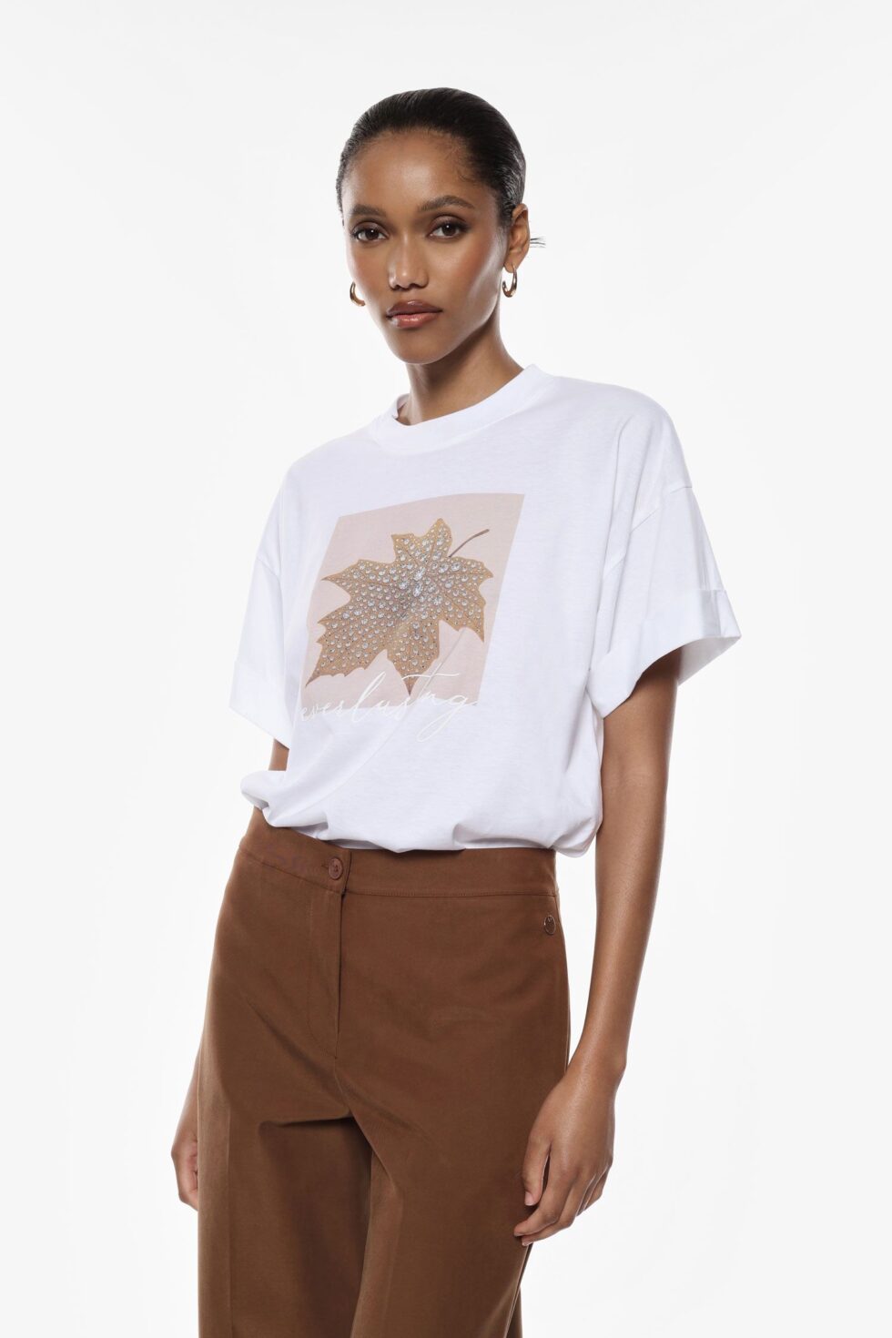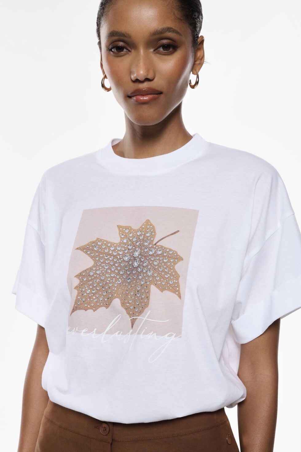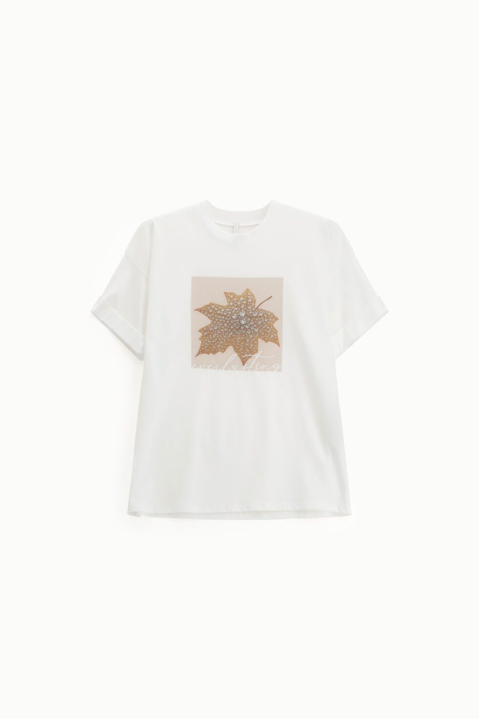 Short-sleeved t-shirt with round neckline, featuring a central print of
