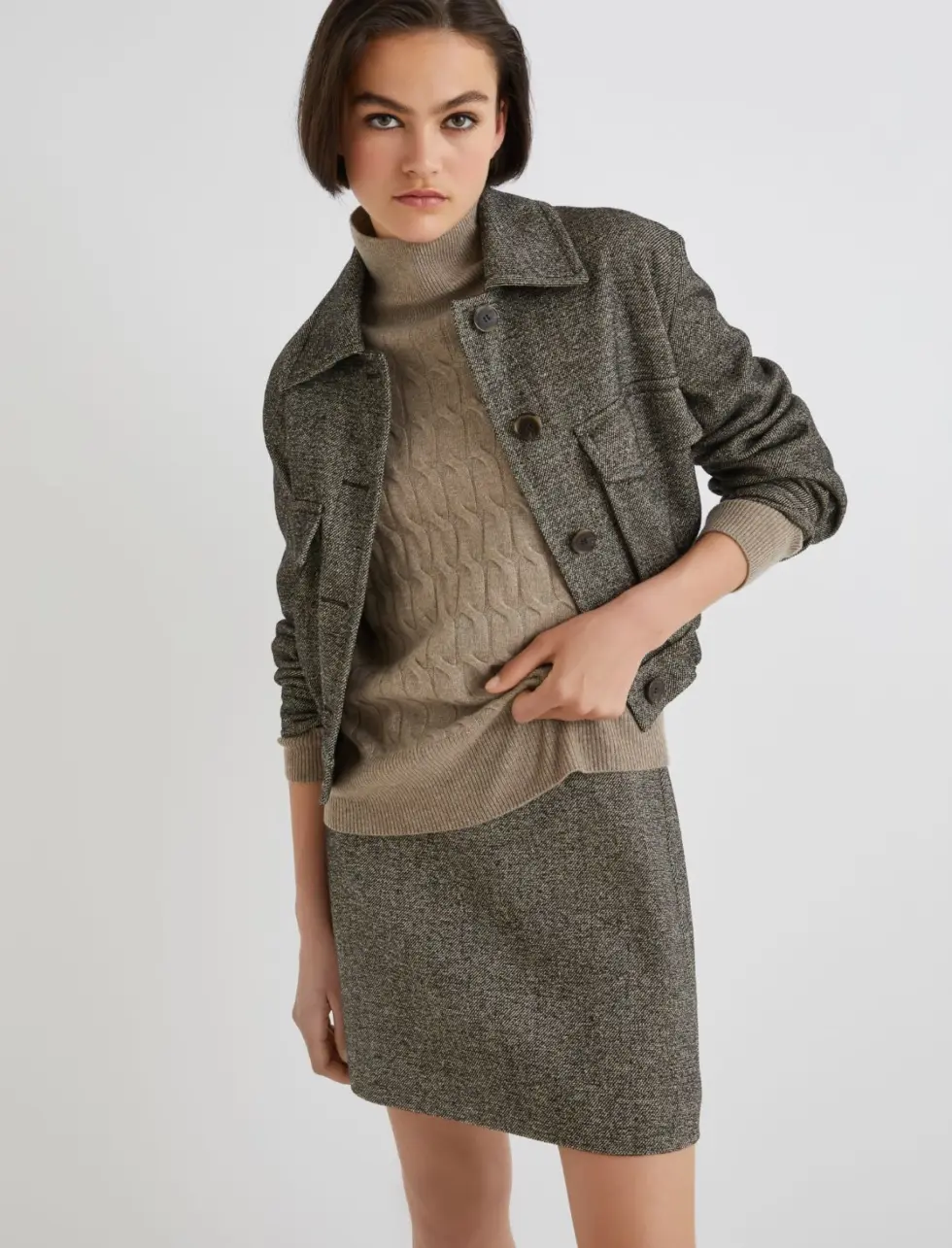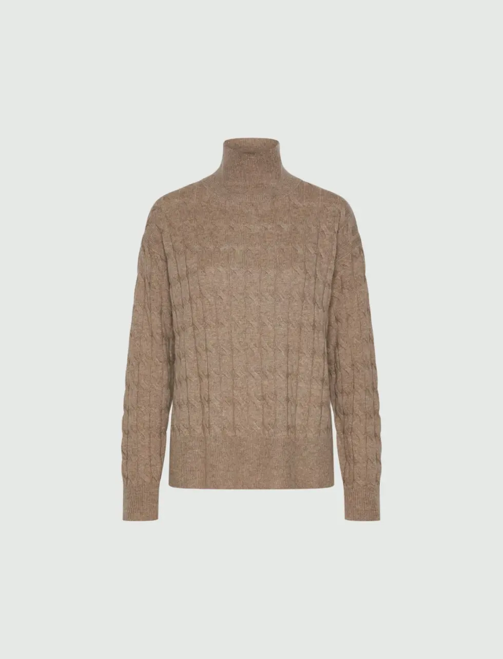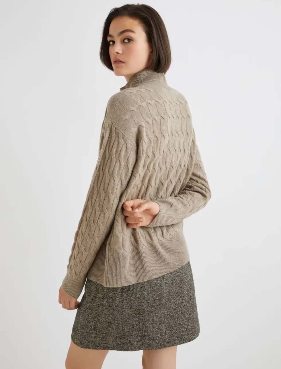 A feminine and chic take on the timelessly charming mock polo-necksweater. The soft wool and cashmere yarn and cable-knit patternmake the garment a new all-rounder for the cold season.